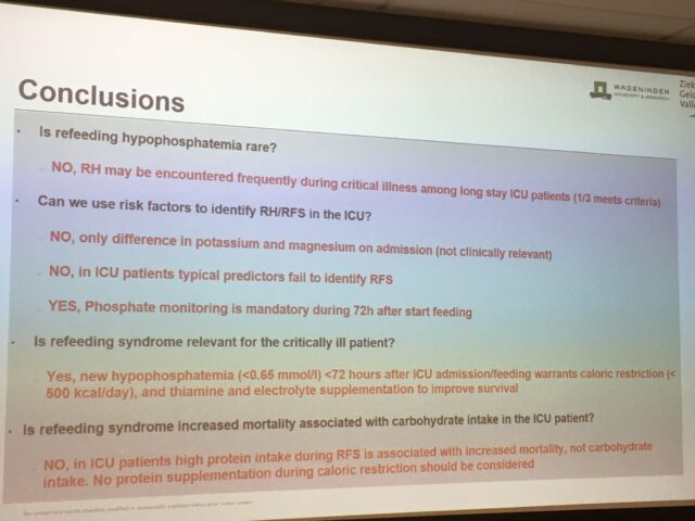Prof. dr. A.R.H. van Zanten, werkzaam als internist/intensivist in het Ziekenhuis Gelderse Vallei gaf uitleg over dit syndroom. Ter inleiding stelde hij eerst de vraag: dragen alle behandelingen bij aan het herstel van de patiënt? Op de Intensive Care worden mensenlevens gered maar behandelingen kunnen ook grote gevolgen hebben voor patiënten. Het ‘refeeding syndrome’ is een verstoring van de stofwisseling die optreedt wanneer patiënten weer voor het eerst voeding krijgen (nadat ze dit vanwege hun kritieke ziekte tijdelijk niet kregen). Er kunnen meerdere verstoringen optreden waaronder een te laag vitamine B1 gehalte, overvulling (teveel vocht in de weefsels en de bloedvaten), onvoldoende reactie op insuline (insuline-resistentie), verstoringen in het brein, etc. Op de foto hieronder staan aandachtspunten die prof. van Zanten benoemde. O.a. is het goed om het fosfaatgehalte in het bloed goed in de gaten te houden, en voorzichtig te zijn met de hoeveelheid eiwitten bij het opstarten van voeding. Het zou mooi zijn als er ‘biomarkers’ (signaalstofjes in het bloed) zouden worden ontdekt, die tijdig en precies laten zien of een patiënt een risico heeft op het ontwikkelen van ‘refeeding syndrome’ zodat op tijd ingegrepen kan worden.